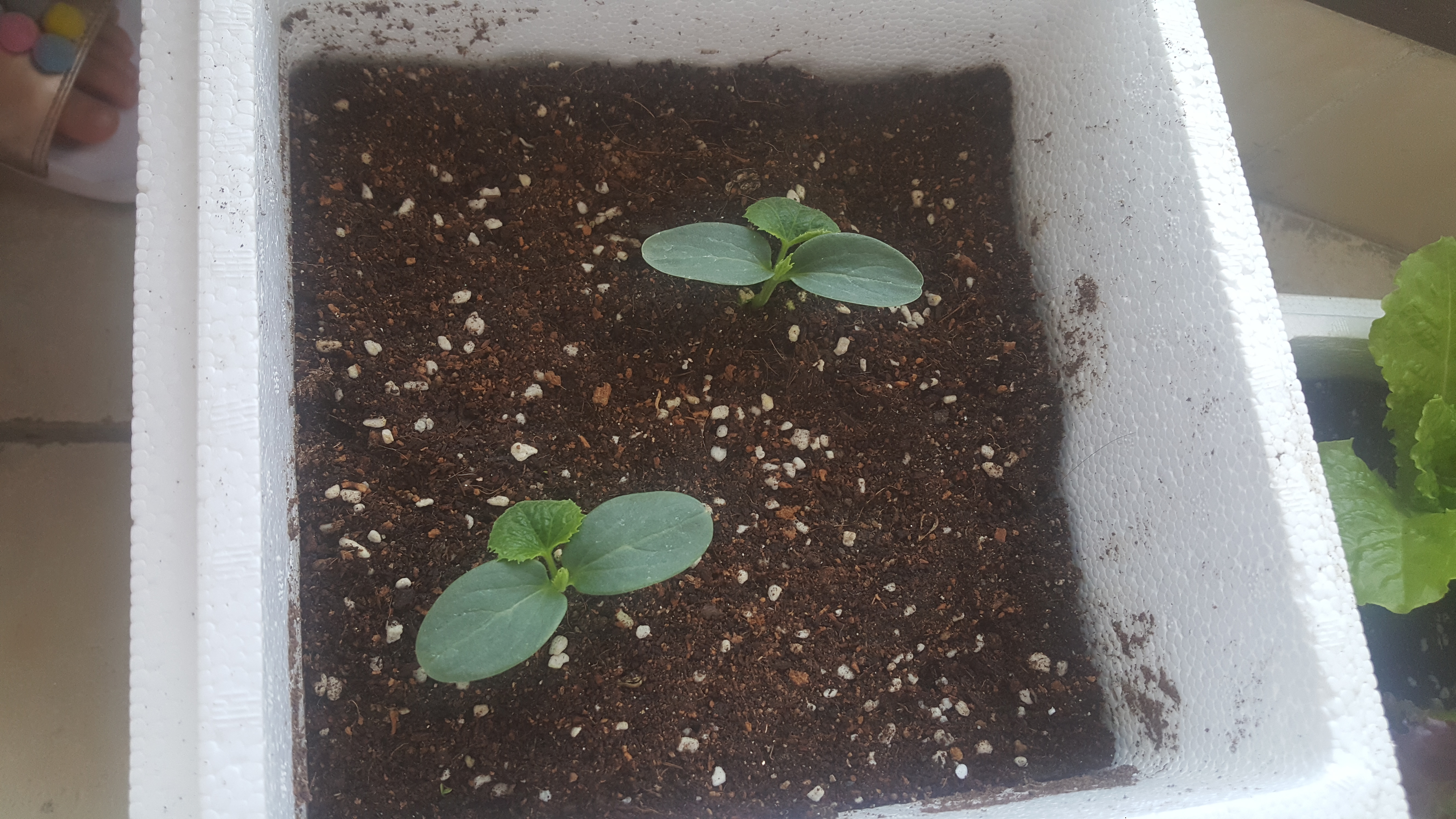 둘째아이 식물 : 오이2- 뜌브, 적상추1 - 쑥쑥이, 적상추2 - 초롱이, 적상추3 - 또롱이