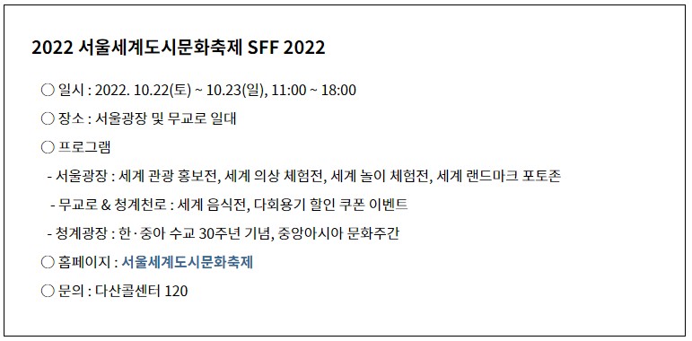 2022 서울 세계도시문화축제가 10월 22일과 23일 양 일간 서울광장, 무교로, 청계천로 등 서울 도심에서 열린다 고합니다.